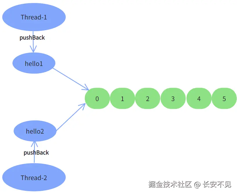 所以我们也是用这样的思路来解决类型转换问题。解决完泛型问题,我们来设计pushBack方法,这个方法的设计目标是将请求入队的元素放在队尾,如果我们基于引用实现,在类里面我们可以放一个尾节点(指针)指向最后一个节点。用数组实现的时候我们存储的就是尾节点的下标了,在一开始队列初始化的时候尾结点和头节点可以都指向0下标,于是我们就需要有一个方法计算出来我们的元素应该放在哪个位置,我们自然就想到了取余,pushBack方法将元素放在队尾,设定我们有hello5、hello4、hello3、hello2、hello1 这五个元素依次通过进入队列,hello5对应0位置,hello4对应1位置,hello3对应2位置,hello2对应3位置,hello1对应4位置: