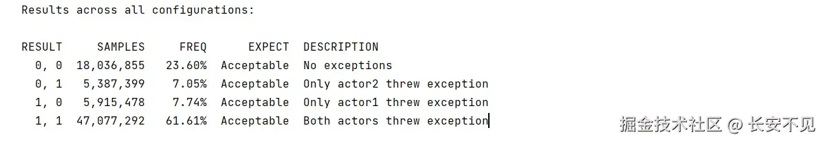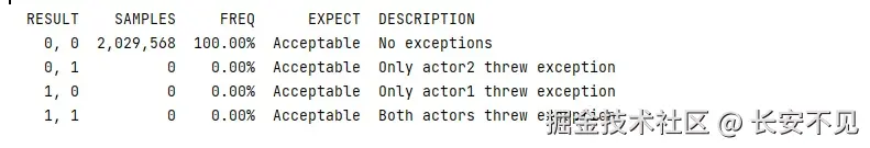 但其实结合入队方法来看,入队方法之后头指针就会走到数组的0位置,然后这个时候再出队,触发语句一,就会造成队列里面有值,但是出队元素为null的状况。这个时候就突出了JCStress的重要性,我迫切的希望我根据理论进行预测的时候,结果是可观测的,可验证的。如果用普通的线程池去跑这些例子,跑出来的结果是不稳定的。尽管并发的行为的确是不可预测的,就像扔一枚均匀的硬币一样,在扔出去之前,我们无法知道硬币会朝上还是朝下,但是我们知道实验足够的多,正面出现的次数和背面出现的次数会向1:1靠近,JCStress就满足了我的要求替我跑足够的次数,跑出所有并发的结果。
