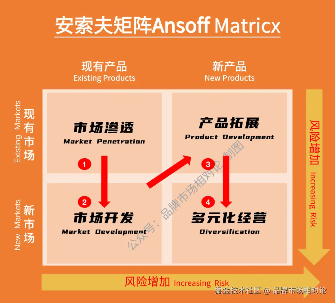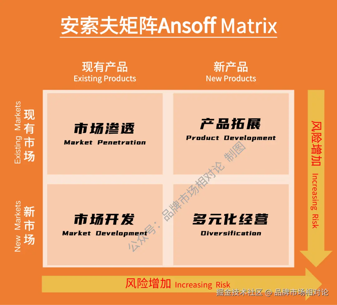 可以看到,安索夫矩阵Ansoff Matrix中由横轴的产品和竖轴的市场围成了4个象限: