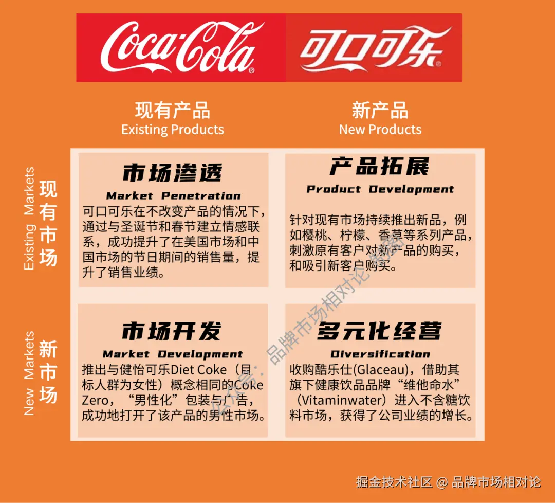 我们可以用可口可乐作为案例,基于安索夫矩阵Ansoff Matrix分析其在其近100年历史中采取的一些产品市场组合增长战略。
