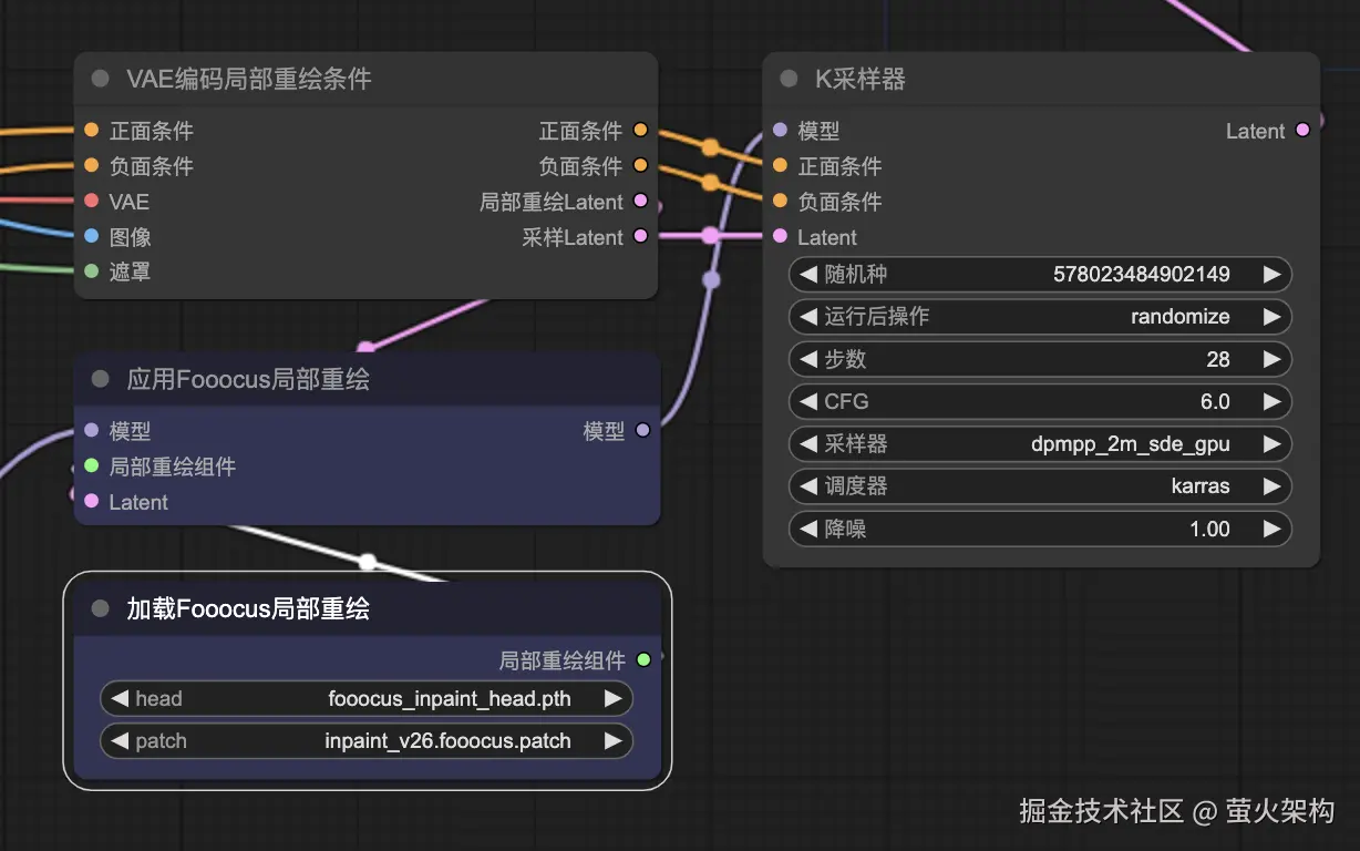VAE编码局部重绘条件:这是 Inpaint 插件提供的,输出两个Latent,分别用于采样和Fooocus, 可以减少VAE编码次数。