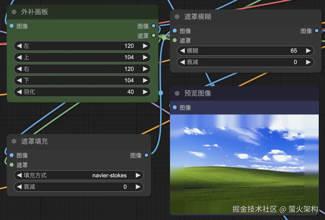 用来控制外扩部分的重新绘制,用到的主要插件是:github.com/Acly/comfyu…