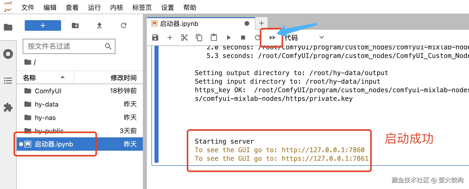 在“启动器”页面,点击双箭头按钮启动程序,待显示 http://127.0.0.1:7860 就代表启动成功了。