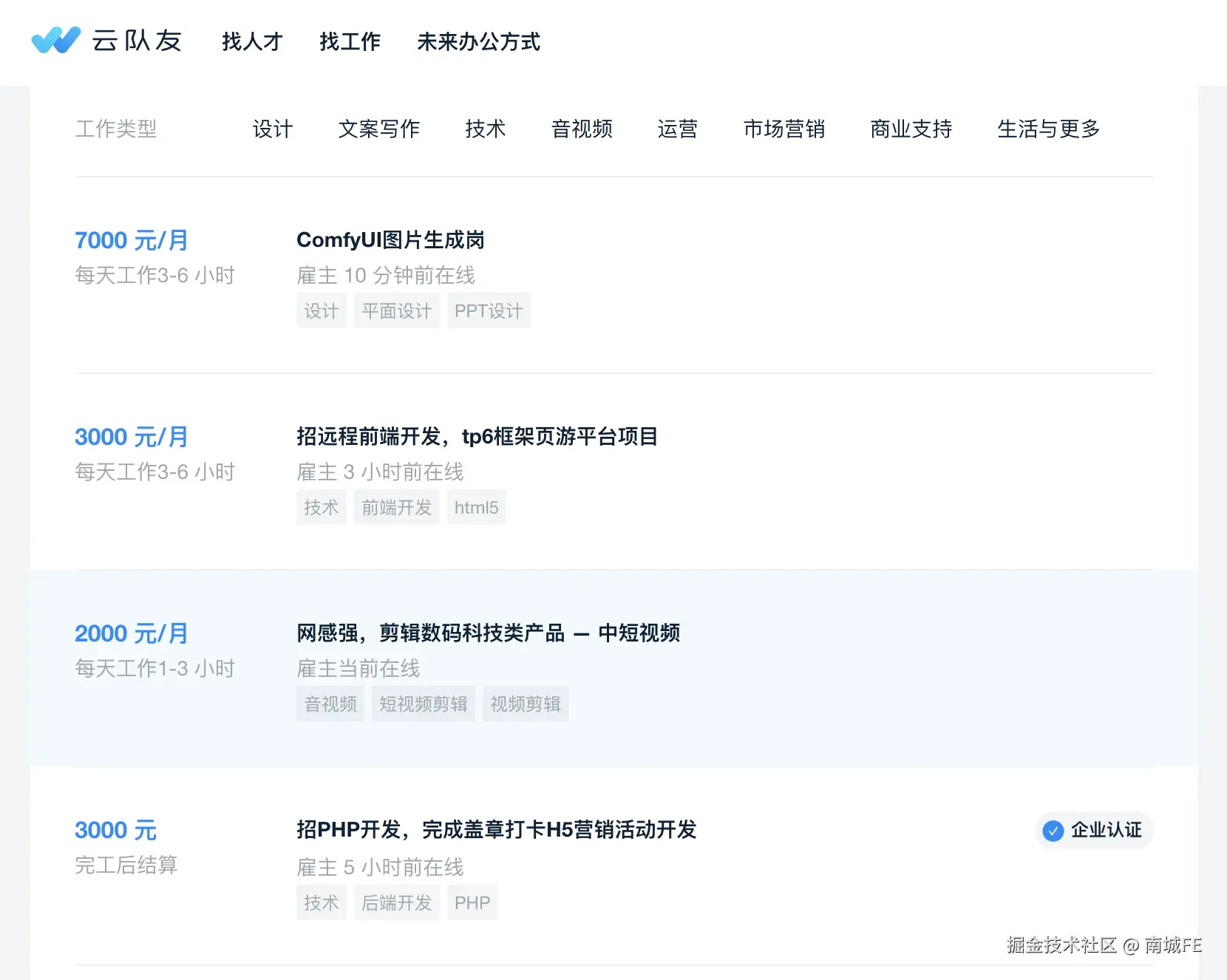 云队友专注于帮助有远程工作,兼职工作人才雇佣需求的企业寻找远程工作人才。为自由职业者等远程工作人才提供技术开发、设计、运营等远程工作机会。