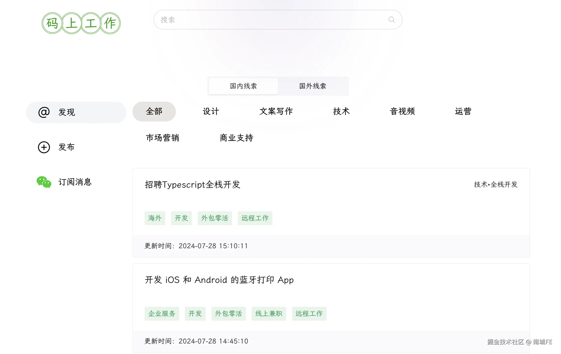 码上工作平台专注于聚合国内外的优质远程工作线索,覆盖兼职、外包、自由职业等多个方向。它为希望灵活工作的专业人士提供了一个发现理想远程职位的好去处。