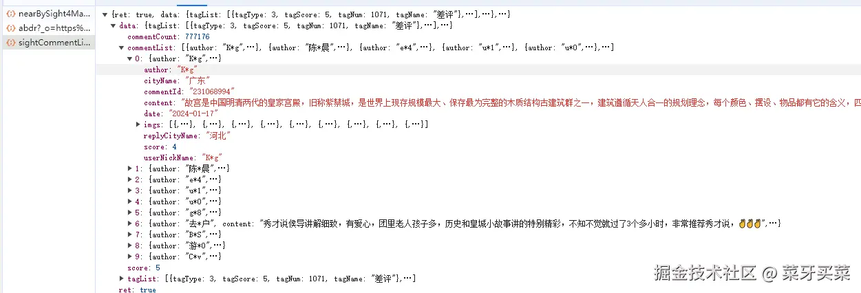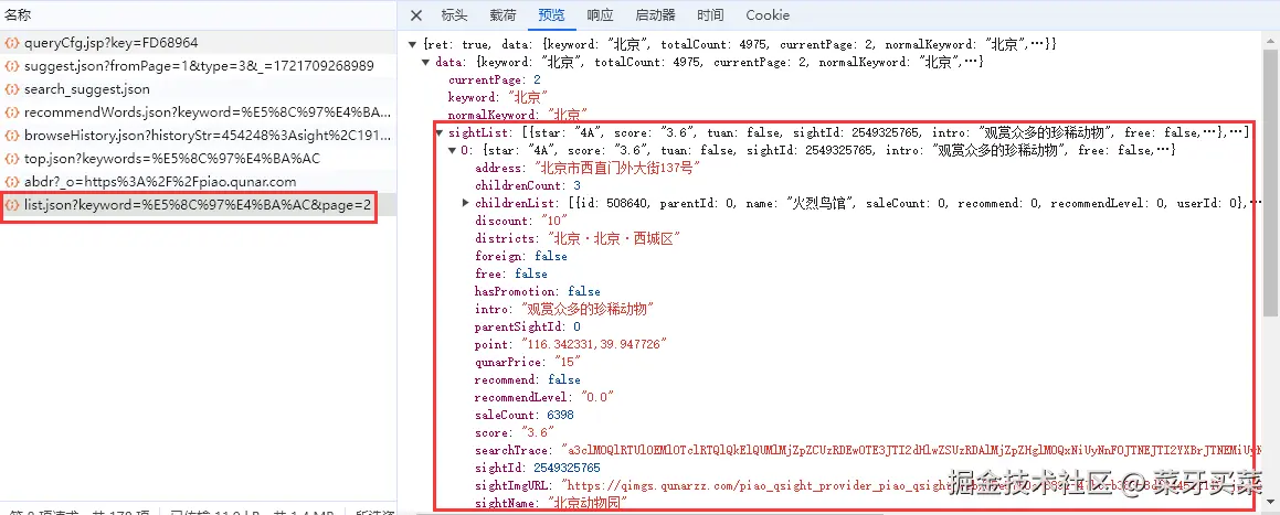 当然请求里的景点数据有些字段是没有的,需要我们进入到景点的详情页去爬取