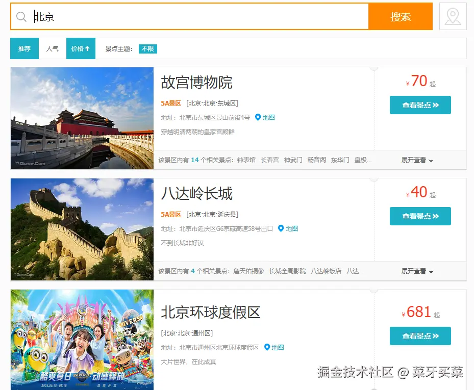以地区为北京的景点为例子,搜索结果如下