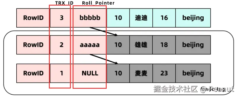 m_ids字段有 [2, 3] ,事务4查版本链的时候,发现第一条trx_id为3,3在readView的m_id中,那不可见,继续查下一条trx_id为2,也在m_id中所以不可见,下一条trx_id为1,比m_up_limit_id字段小,那可见,所以事务4查到的是最下面那条数据版本。