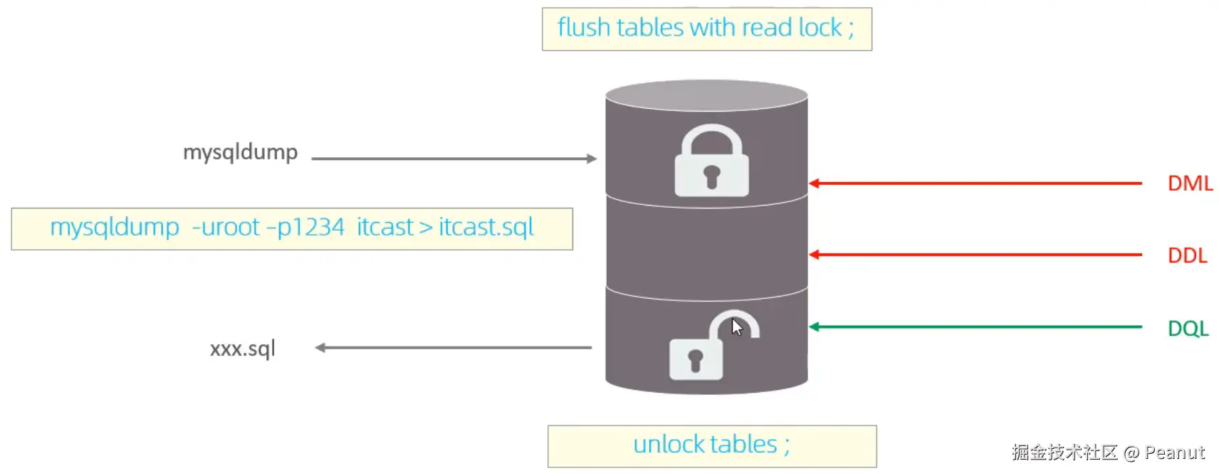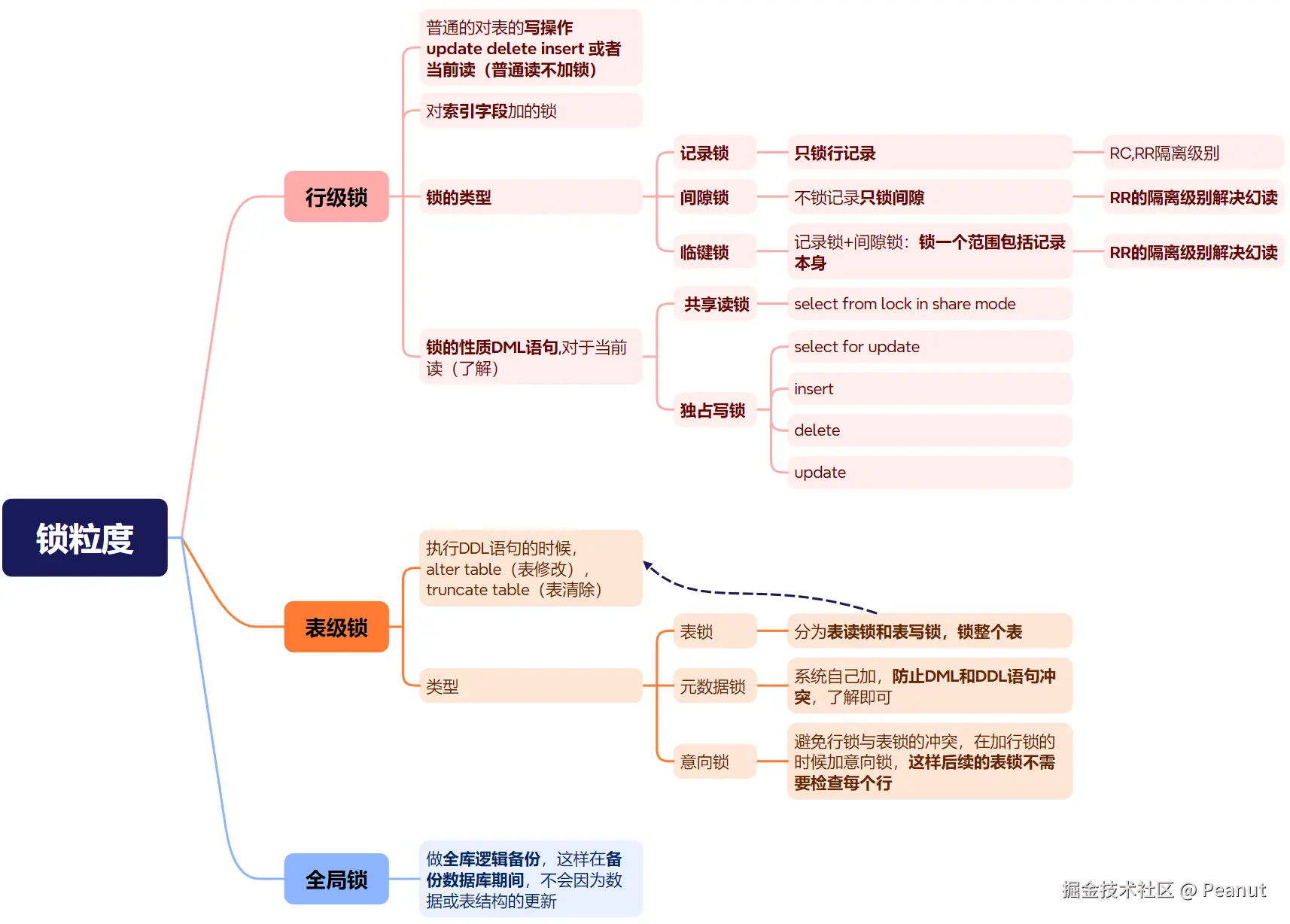 还有全局锁。全局锁:通过flush tables with read lock语句会将整个数据库就处于只读状态了,这时其他线程执行以下操作,DDL或者DML / 增删改或者表结构修改都会阻塞。