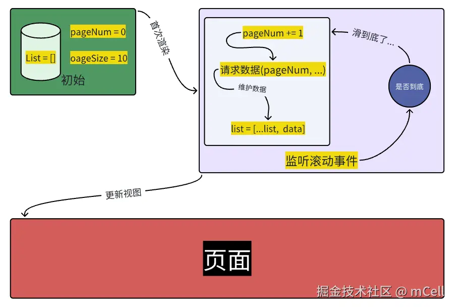维护一个list数组存放数据,初始时pageNum为0,首次请求数据的时候,pageNum+1,表示请求页码为1的数据内容,对窗口进行滚动事件监听,当用户滚动到页面底部的时候,触发数据请求函数,函数里面pageNum+1 = 2 , 此时会请求并返回第二页的内容,我们再维护list数组就实现了一次loadMore,依次循环往复,每次到底就pageNum+1,然后请求数据,再维护list数组