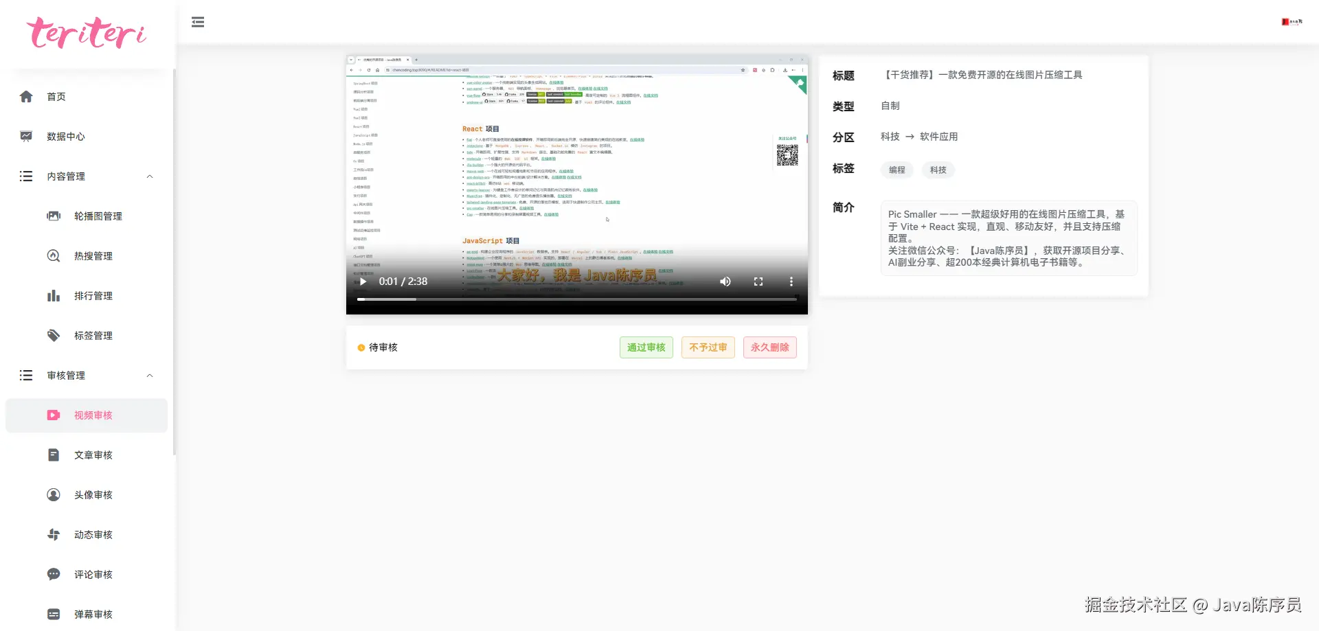 视频审核是后台管理中的功能,后台管理目前只开发了视频审核功能。