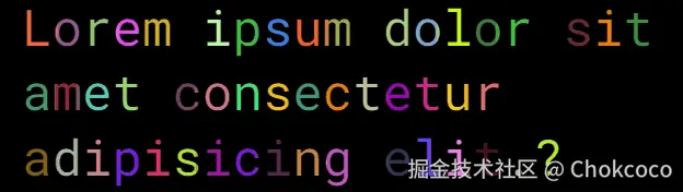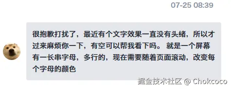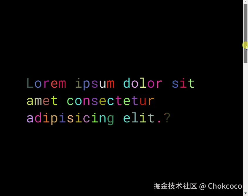 这里和这位同学细聊,他没有回复,有一个细节我没获取到,就是多行文本一开始是文字颜色是规律的还是不规律的,另外一个点,随着页面滚动,改变每个字母的颜色,需要有规律的改变,还是没有规律的改变?