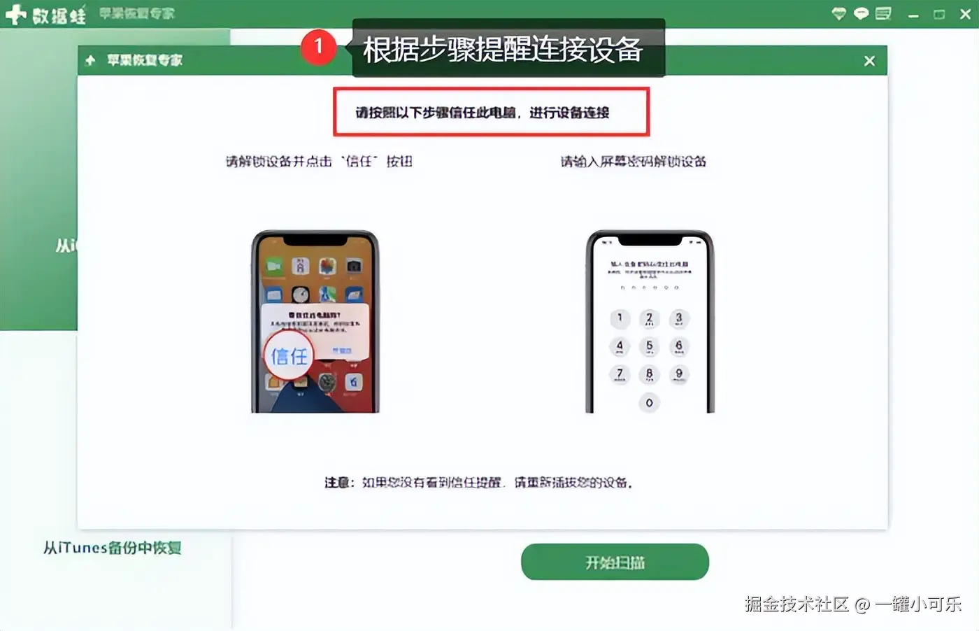 第2步:在扫描的过程中,界面将提示您是否信任此电脑,需要您的苹果设备上解锁并点击 “信任” ,以建立连接。
