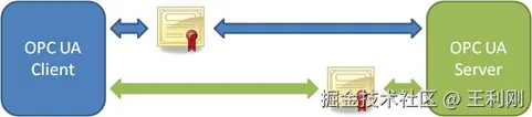 在上图 中,OPC UA 服务器和客户端依赖唯一的证书进行通信。OPC UA 支持 PKCS12 公钥加密标准,提供 X.509 私钥和包含公钥的证书文件。服务器和客户端都可以选择使用哪对公钥和私钥。为了在服务器和客户端之间进行通信,用户可以选择三种消息模式之一:无、签名、签名和加密。此外,用户可以启用两种安全策略之一:Basic256 和 Basic128Rsa15。这些安全策略是签名或加密客户端和服务器之间数据的算法基础。