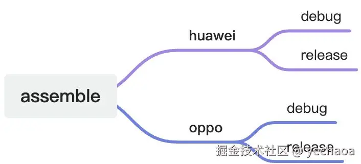- 蓝色框为两两的构建组合选项,一次执行会打出2个包,比如执行assembleDebug会打出huaweiDebug包和oppoDebug包;
