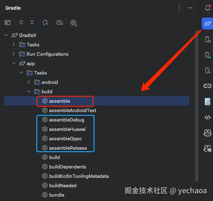 在Android Studio右侧打开Gradle 面板,在build目录下可以看到具体的构建选项。
