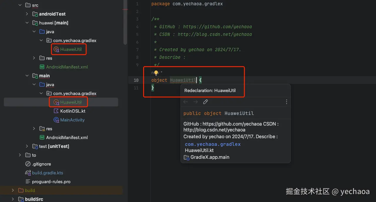 比如先在huawei渠道下新增一个名为HuaweiUtil 的类,然后在main目录下也新增一个HuaweiUtil的类,则会出现同名异常(Redeclaration)。