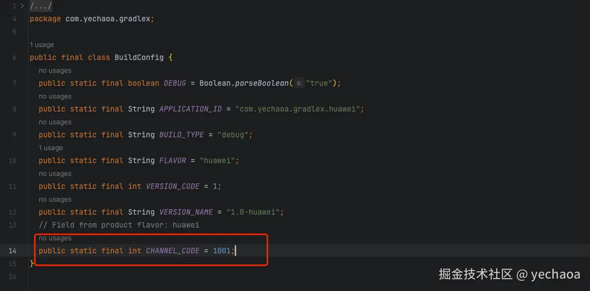 通过BuildConfig.CHANNEL_CODE就可以引用了。