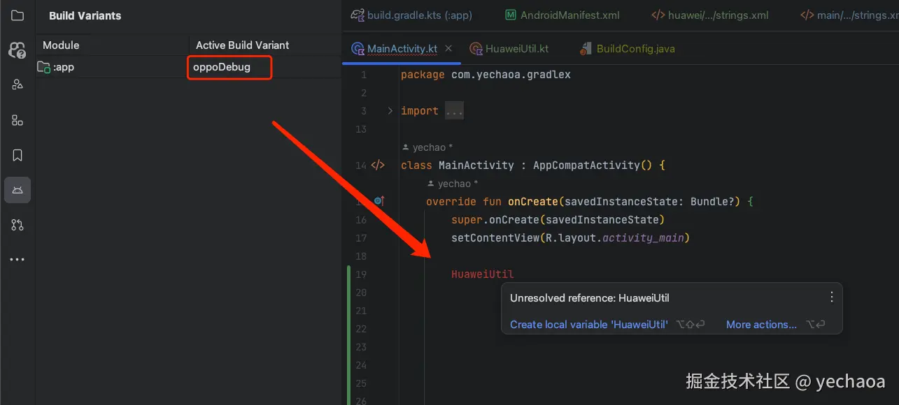 比如当我切到oppoDebug渠道变体时,在main中就无法找到HuaweiUtil类: