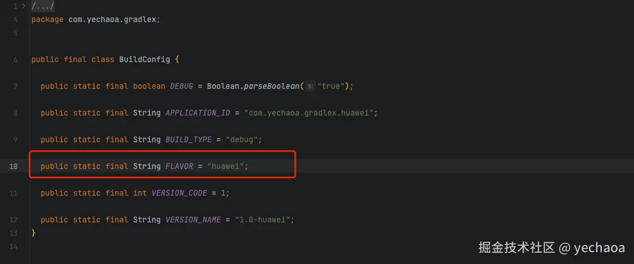 Log.wtf("yechaoa", "flavor = " + BuildConfig.FLAVOR)