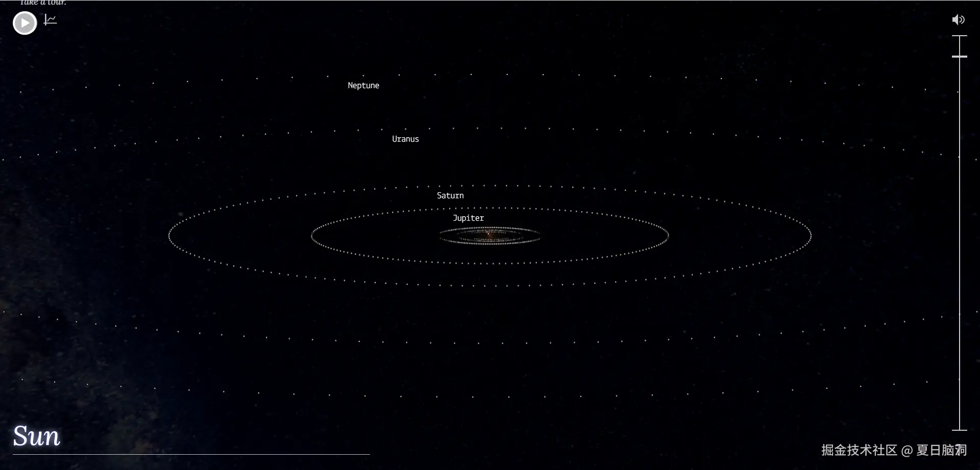 这是一个让人非常惊艳的网站,你可以通过这个网站在银河系尽情地遨游,点击左上角的播放按钮后会自动播放关于银河系的科普小视频,播放完后你可以用鼠标拖拽来调整观看银河系的角度,还可以滑动鼠标滚轮来放大或缩小银河系全景。