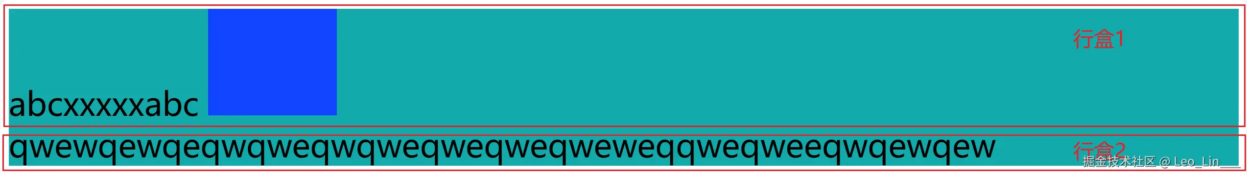 注意,文本是具有行高的,行高会撑起一个行盒的高度,没有文本的行内级元素(如img、inline-block)的基线是在元素底部。而行盒中元素默认对齐方式又是baseline。因此可以观察到上图中行盒1的蓝色盒子的底部与文字基线对齐,且行盒1底部以及行盒2的底部看起来有一些空余。