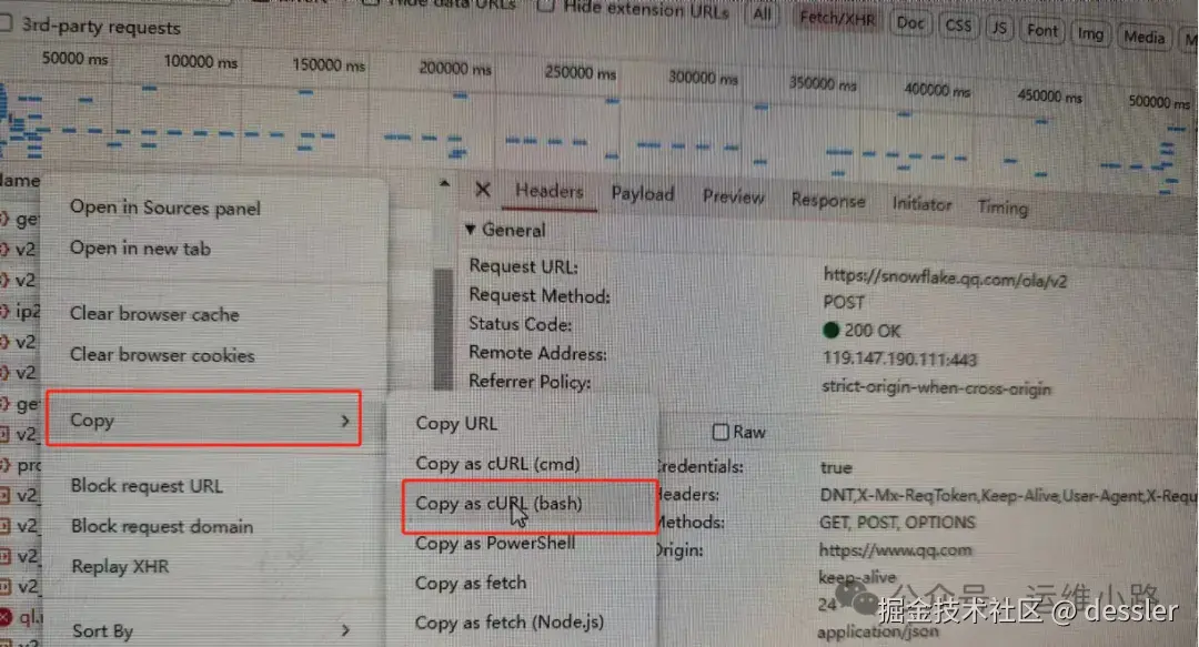 这个就是选择一个后端api接口,然后右键-Copy-Copy as cURL(bash),由于一般都在Linux操作,所以选择的是复制到bash里面可用的,这个复制会获得一个类似下面的字符串,可以用这个请求在Linux服务器里面执行。