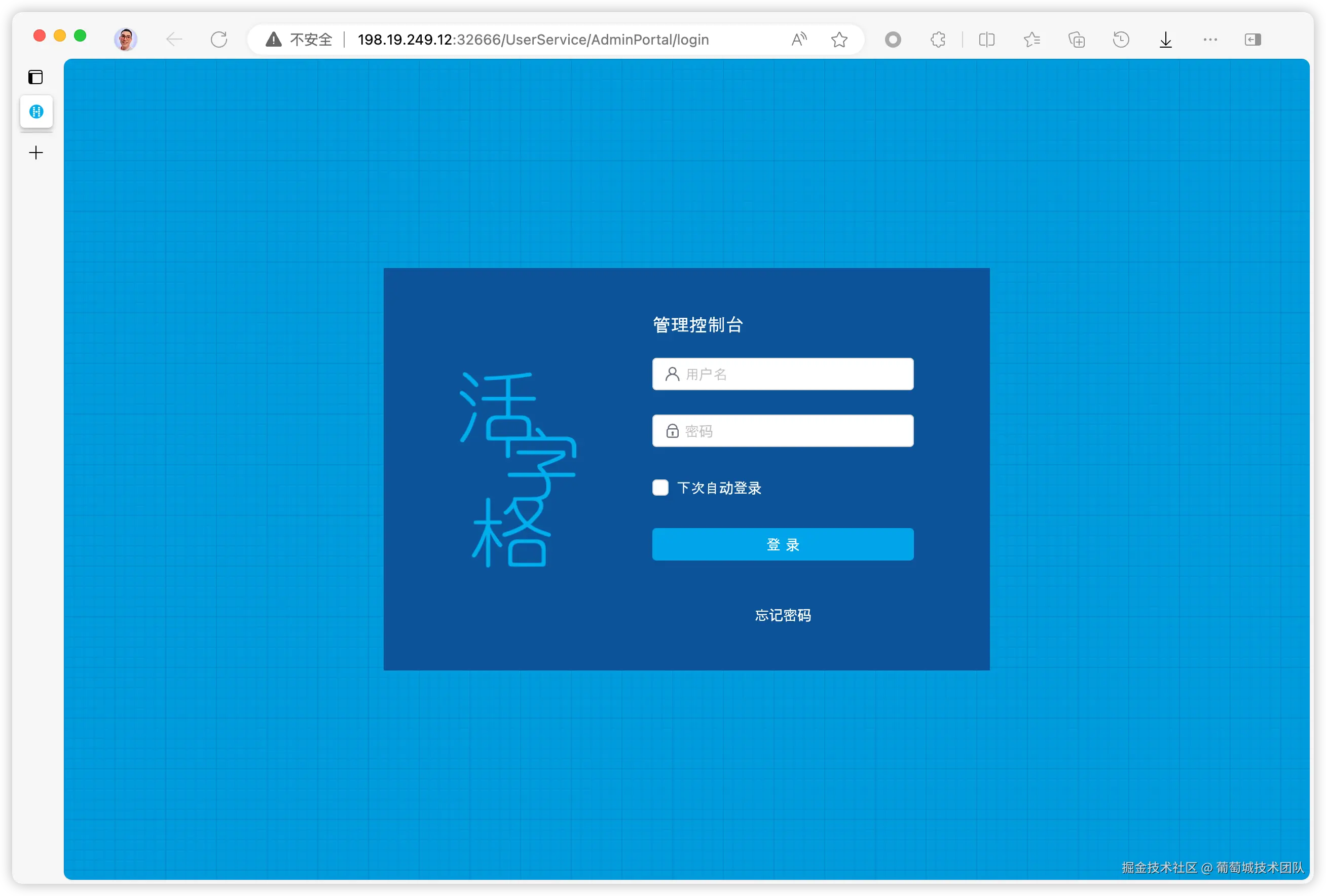 同时,针对于对应的 deployment,会创建相应的 service。服务会通过 service 暴露的端口进行提供。外部可以通过任何一个 k8s 节点 IP 加端口号的方式访问到活字格的服务,例如访问活字格管理控制台的访问地址为:http://198.19.249.12:32666/UserService/AdminPortal/。其中,198.19.249.12 是 k8s-server 的 IP,32666 是 forguncy-service 对外暴露的端口。直接在浏览器中访问结果如图。