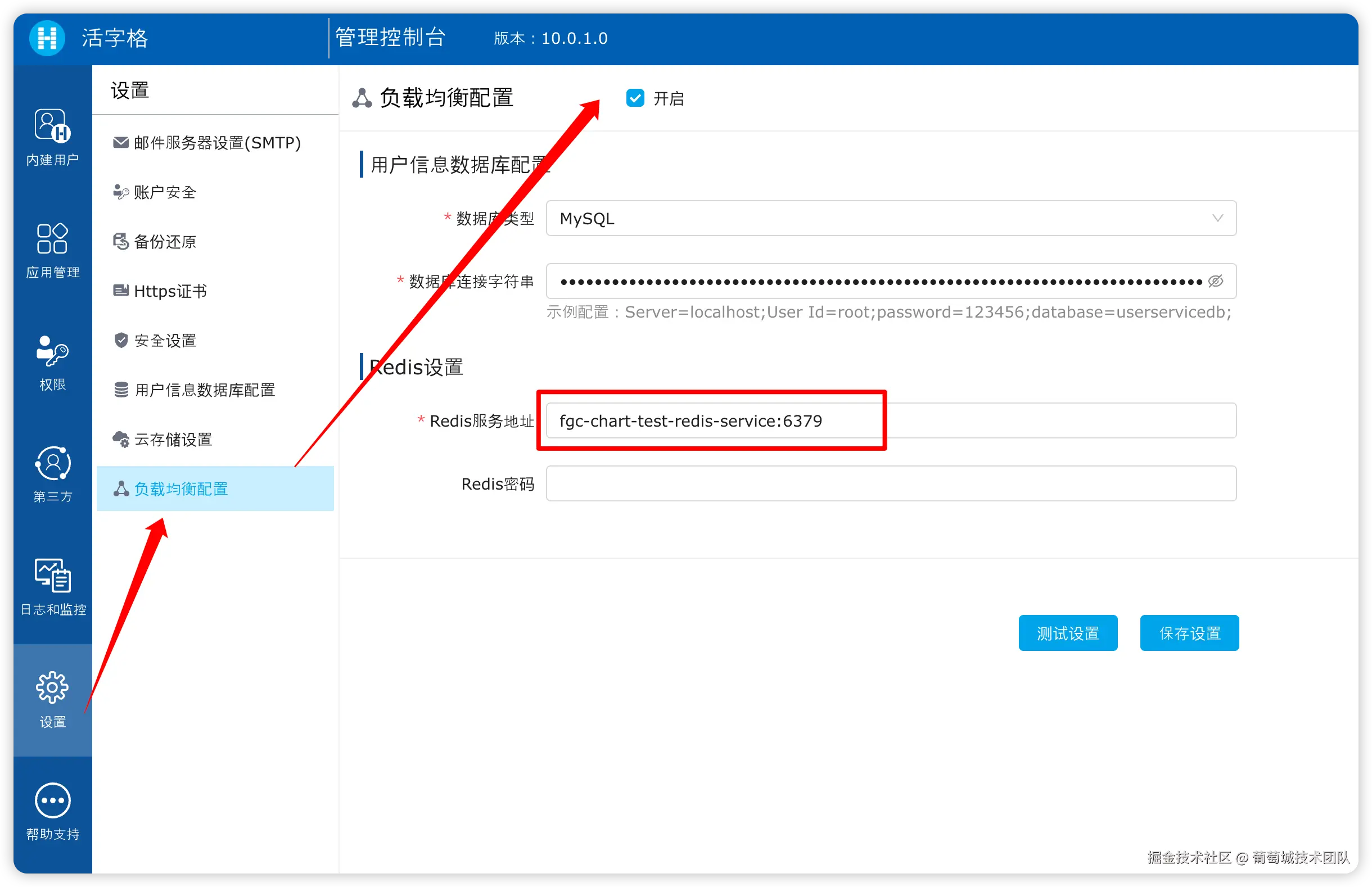 对应的负载均衡入口没有发生变化,仍处于设置列表中。当开启负载均衡后,需要将用户信息数据库配置到外联数据库中。此外,redis 的服务也同样需要配置。需要注意,考虑到 k8s 的特性,每次 pod 的创建与销毁,其 IP 都会发生变化,所以这里 redis 服务应当配置为 service 的名称,而不是特定的 IP。