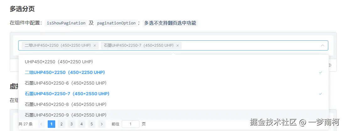 在组件中配置:isShowPagination 及 paginationOption;多选不支持翻页选中功能