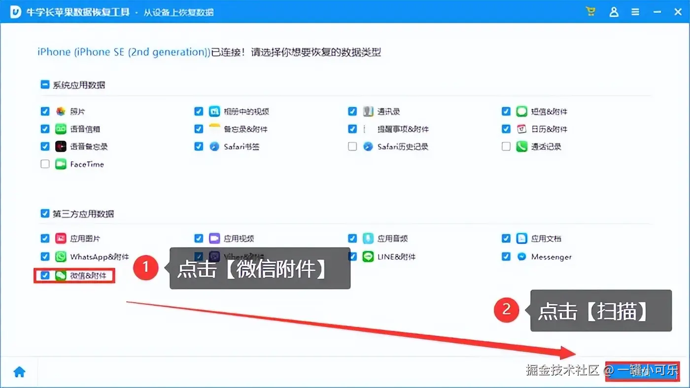 步骤2:连接完成后,勾选 【微信&附件】 ,再点击 【开始扫描】 。