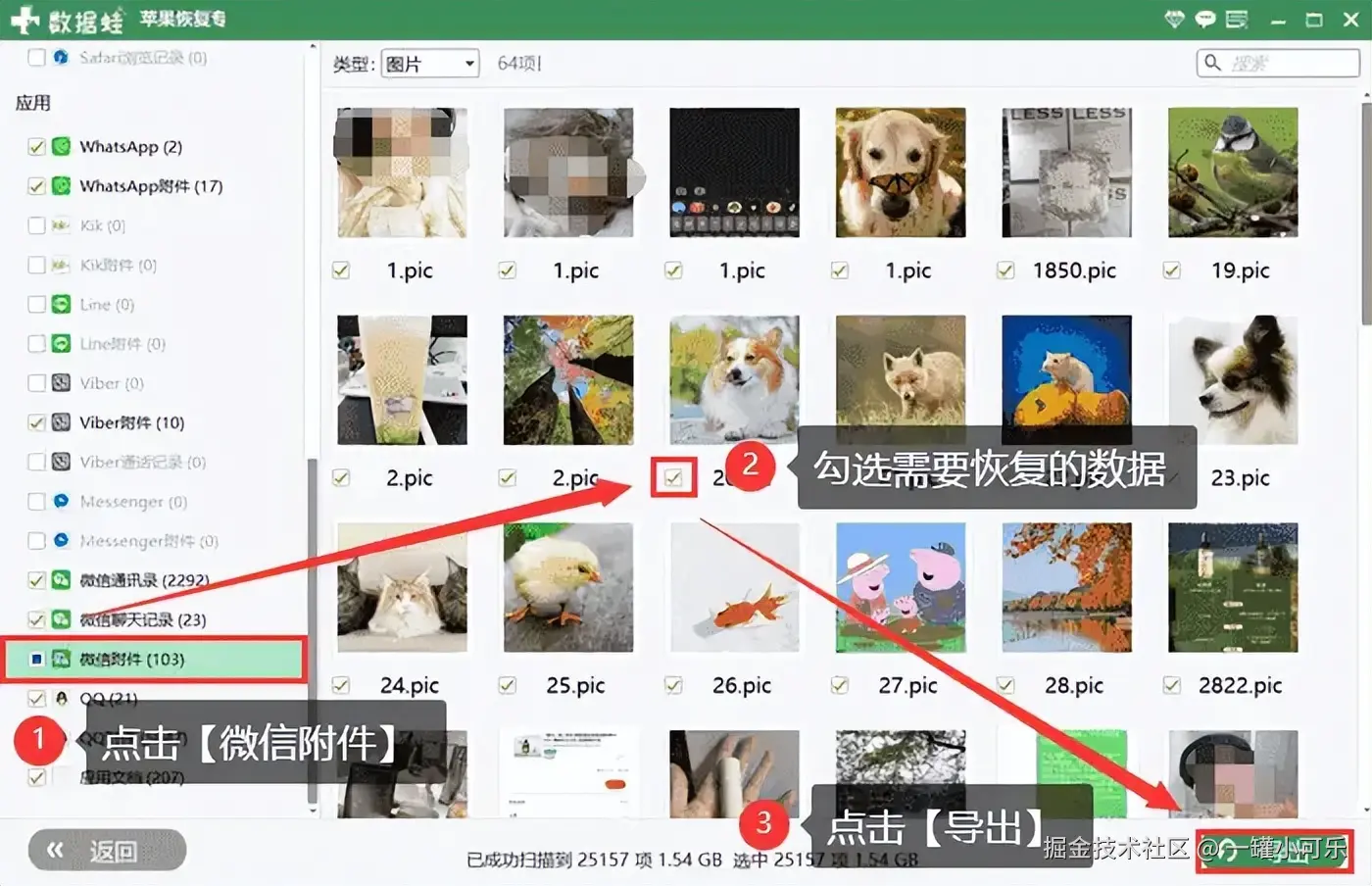 步骤3:扫描完成跳转数据浏览界面,用户可以浏览扫描出来的数据,选择导航栏中的 【微信聊天记录】 选项,浏览选项卡下的数据,用户可以点击界面上方的全选框,也可以筛选需要恢复的内容。例如要恢复的是照片,则选择 【图片】 ,再勾选需要恢复的数据,最后点击 【导出】 即可。