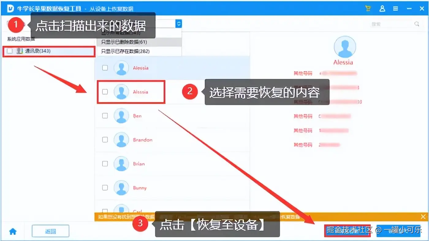 步骤3:扫描完成后则会显示相关数据,勾选需要恢复的数据,点击 【恢复至设备】 即可。