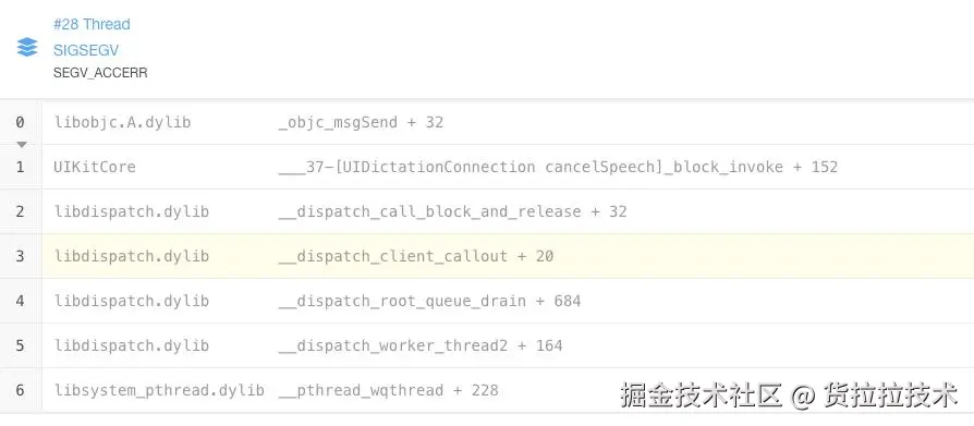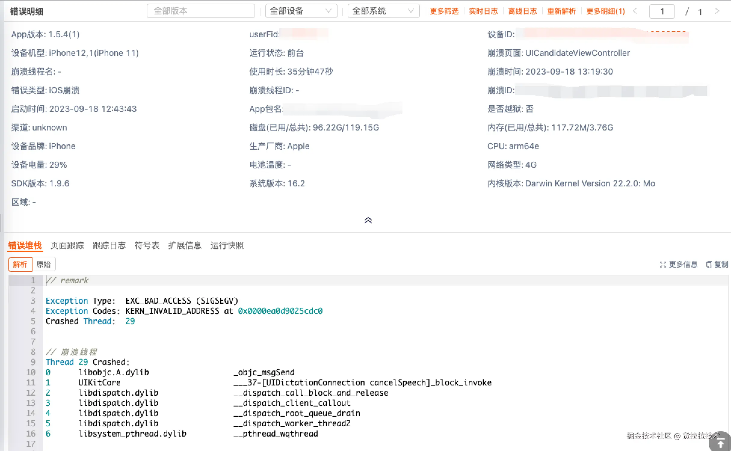 最后我们结合堆栈崩溃在子线程29,且崩溃时候访问了_objc_msgSend,崩溃类型是SIGSEGV,也就是代表多线程读写导致UIDictationController的lastHypothesis时,出现野指针问题。