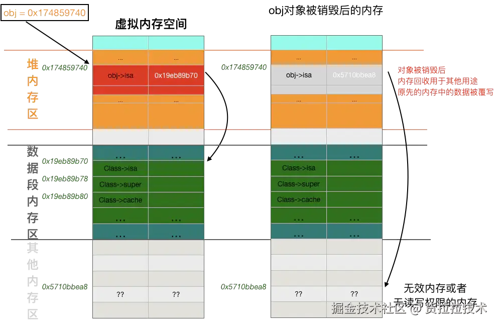 会出现这种问题的原因就是调用方法的OC实例对象被销毁了,内存被回收后,原先的内存数据被复写另外一个地址,这个地址依然属于堆内存区的范围。