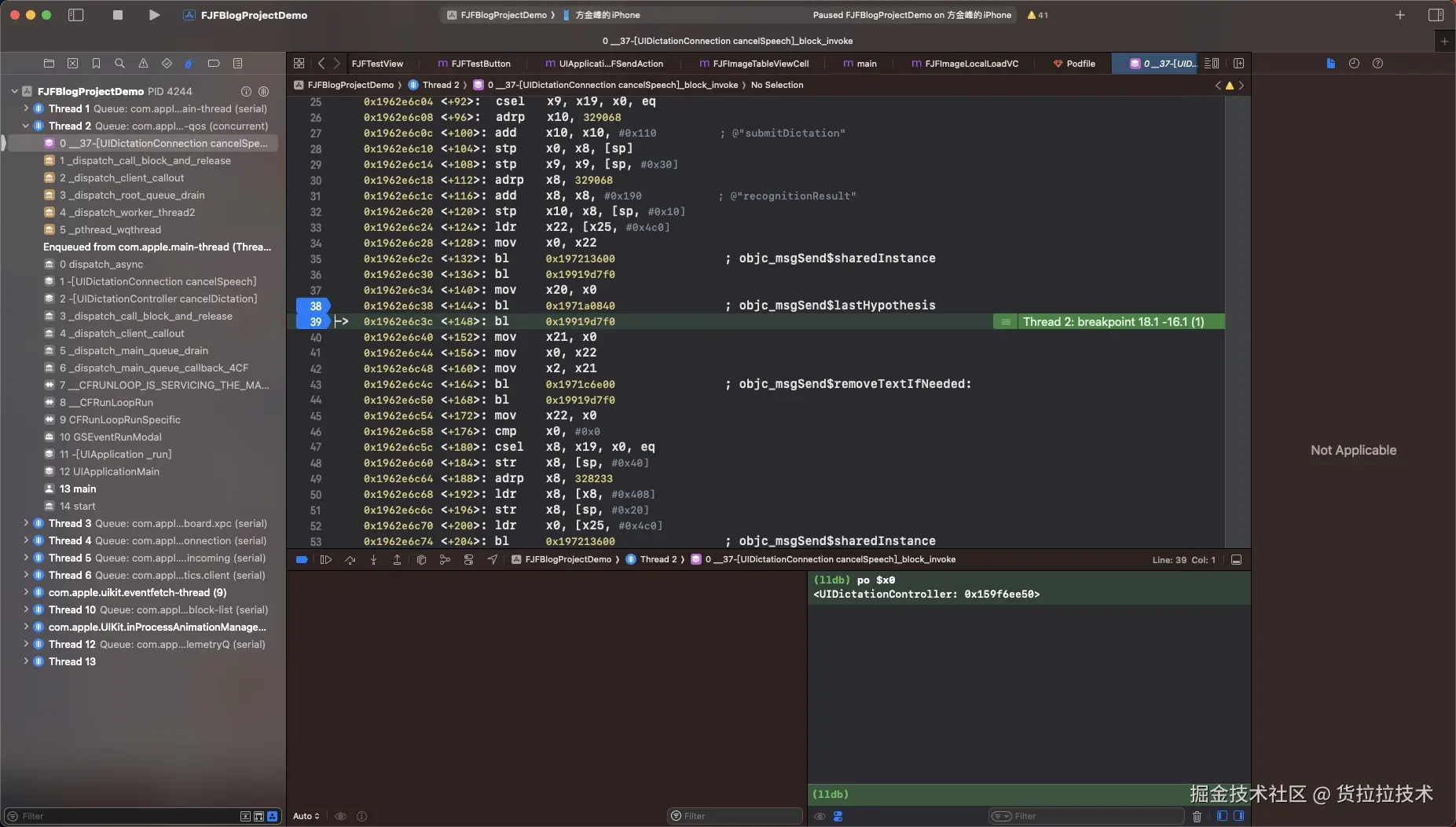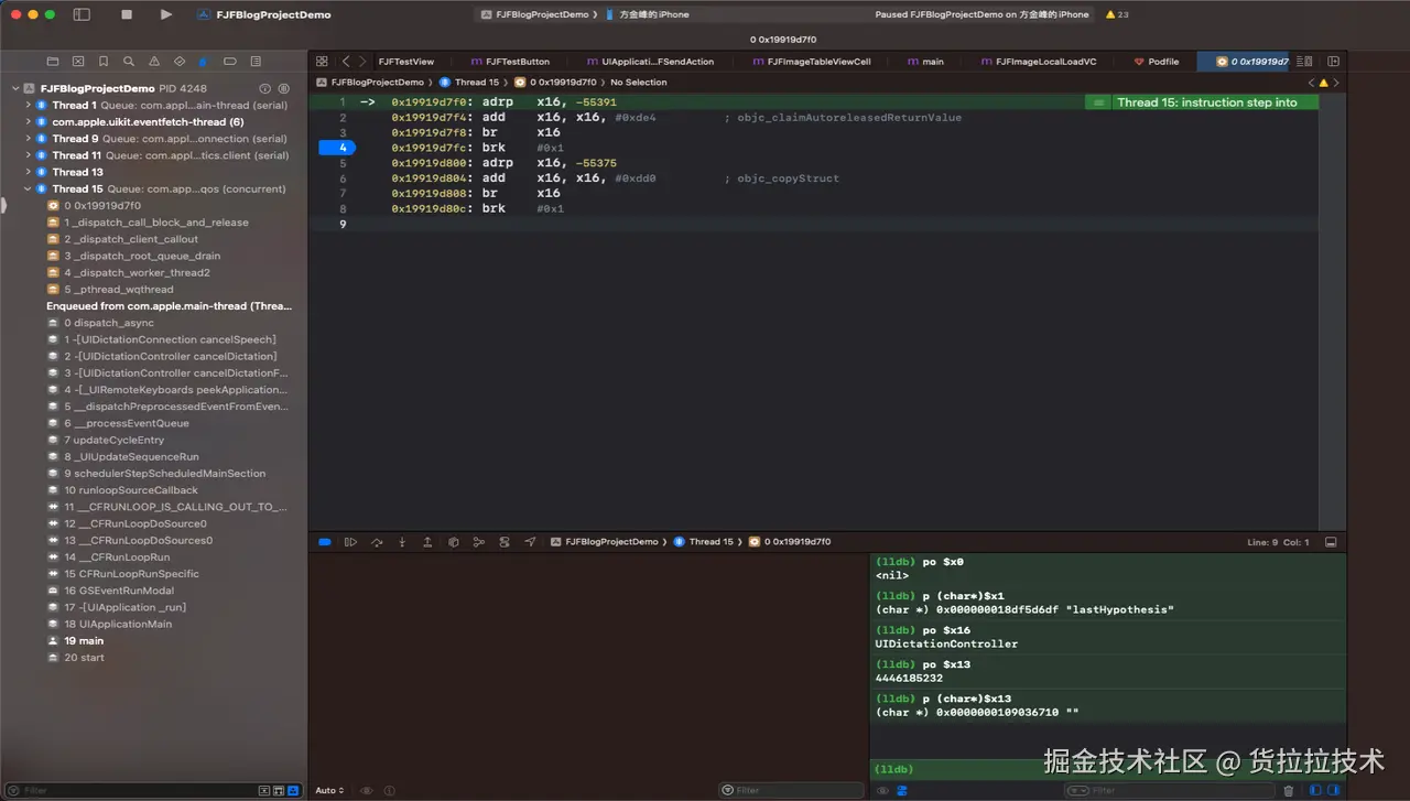 调试过程中,我们打印对应的$x0, $x1, $x16,我们可以看到$x0为nil说明该对象已经为nil,p (char*)$x1 显示方法名称为lastHypothesis,po $x16,显示对象的类,为UIDictationController