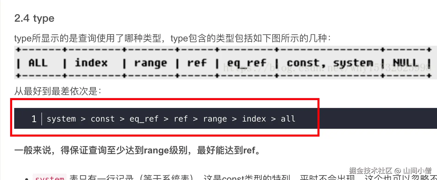 整体的一个执行情况排序,一般来说,得保证查询至少达到range级别,最好能达到ref。