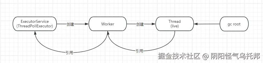 所以,由于Worker持有ThreadPoolExecutor的引用,所以它也不会被回收,用一张图表示就是: