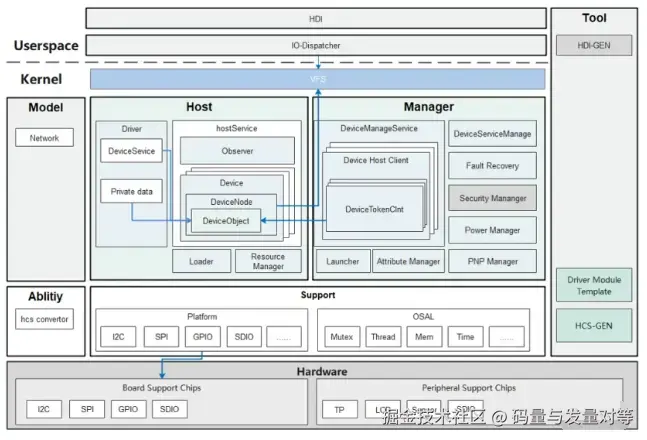 如下图,开源鸿蒙系统驱动框架HDF在内核中的实现,可以分为向用户层提供设备服务的管理模块(Manager),和实际管理硬件的Host模块。