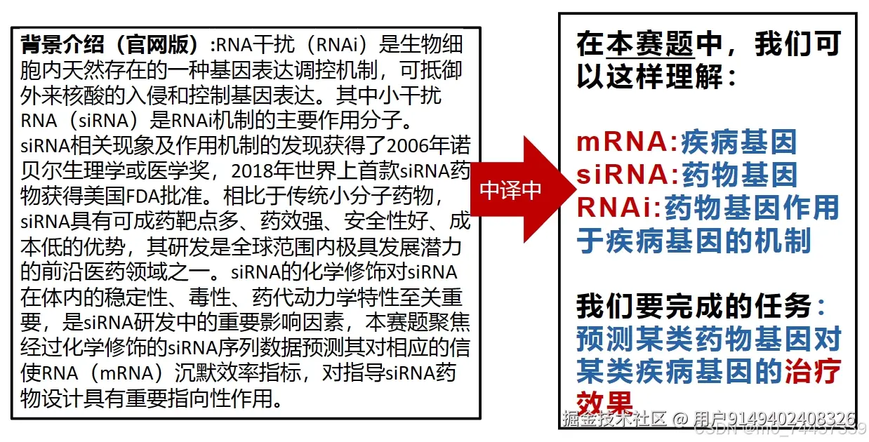 💡PS:本次比赛旨在利用机器学习与深度学习相关技术,通过化学修饰后的siRNA序列预测RNA干扰(RNAi)机制下对靶基因的沉默效率。 mRNA疫苗在新冠预防领域取得巨大成功,推动了核酸类药物的研发。