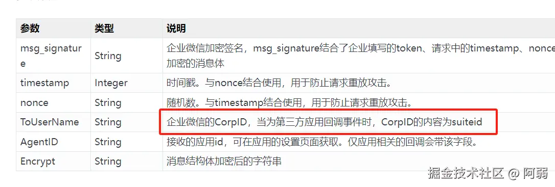 - 在查看上架的日志中,发现除了SuiteId,还传输了别的id,导致验签没过,我暂时不知道是什么id,所以我将这些ToUserName不是SuiteId或者CorpId给过滤了,直接返回success