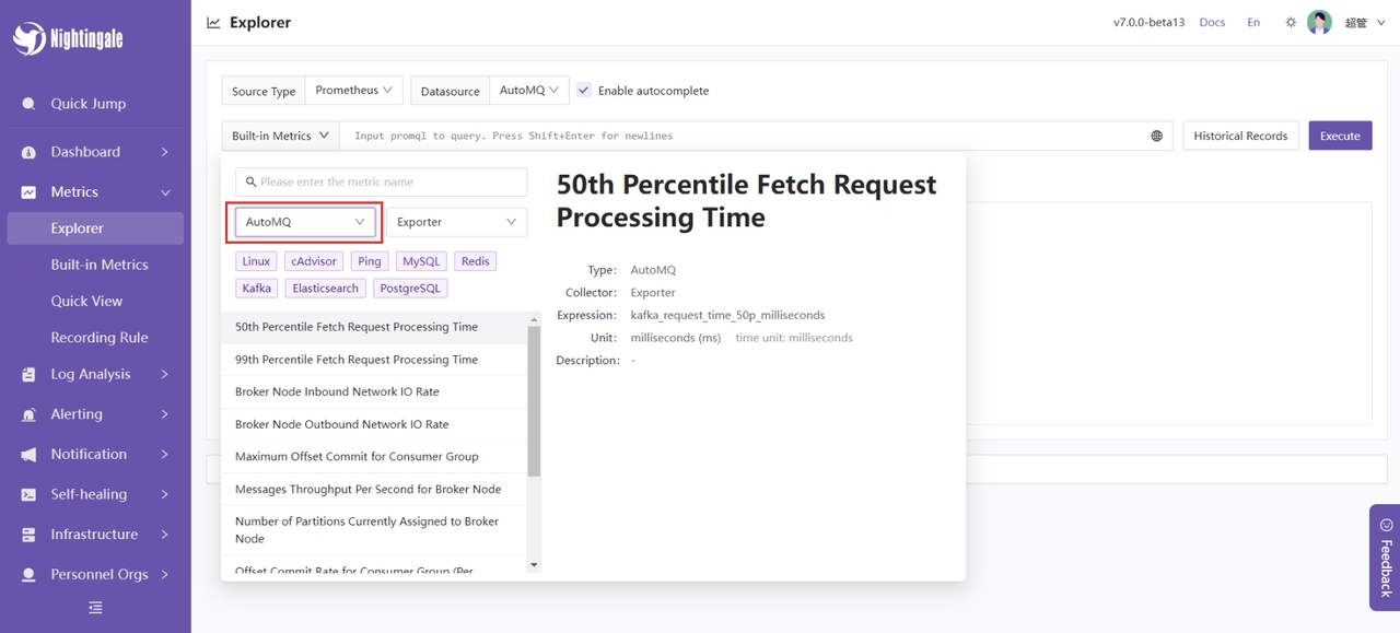 选择内置的 AutoMQ 指标: