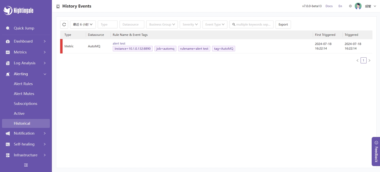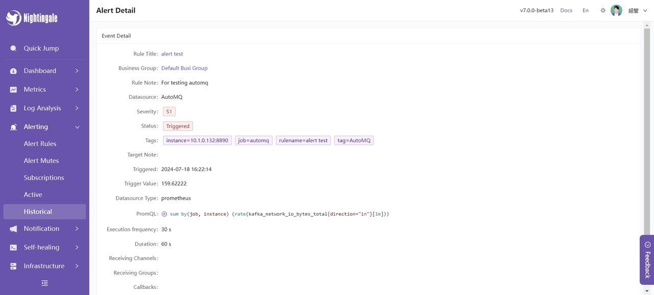 随后我们可以在夜莺控制台看到报警信息:
