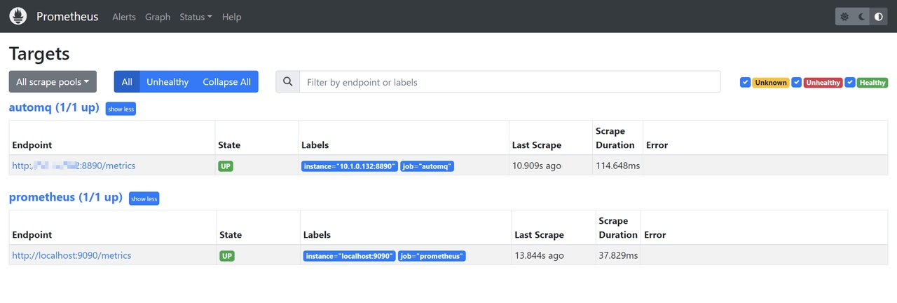部署完成后,我们可以通过浏览器访问 Prometheus,查看是否真正采集到了 AutoMQ 的 Metrics数据,访问http://{client_ip}:9090/targets: