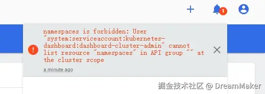 这是Kubernetes 权限问题。错误信息表明服务账户 system:serviceaccount:kubernetes-dashboard:dashboard-cluster-admin 没有在集群范围内列出(list)命名空间(namespaces)的权限。