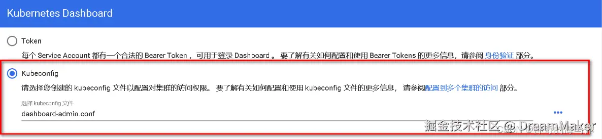 把 /root/dashboard-admin.conf 这个文件下载到本地,之后上传到WEB页面登入即可