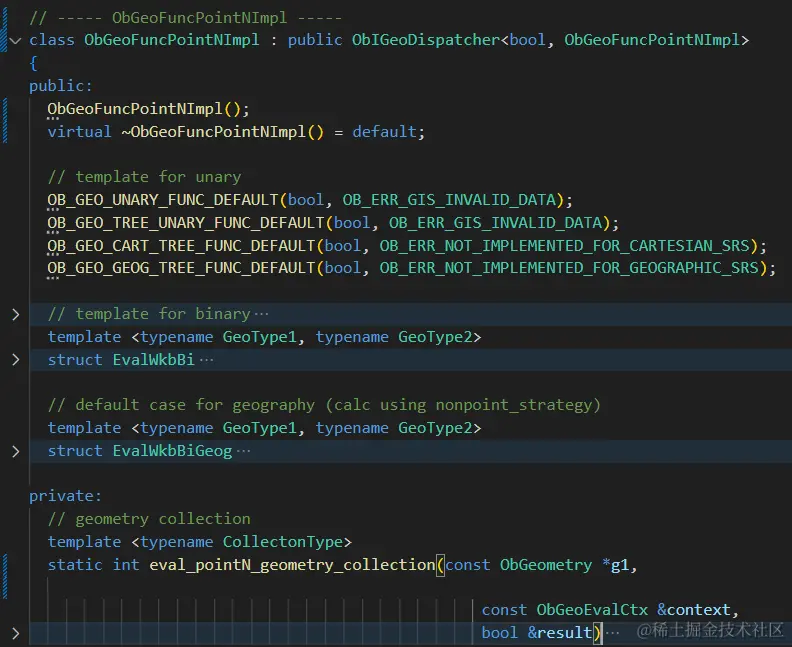 一旦 ObExprSTPointN 类完成参数检查后,它会调用 ObGeoFunc::geo_func::eval 方法。这会触发模板分发逻辑,最终执行具体的算法模块 ObGeoFuncPointNImpl,实现 ST_PointN 的功能。