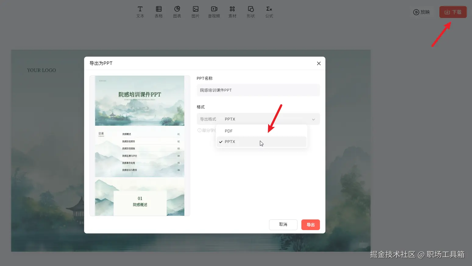 对于完成编辑的PPT演示文稿,我们可以点击博思AIPPT编辑界面右上角的下载按钮,将当前的幻灯片导出为PPTX文件,方便在本地打开或编辑。