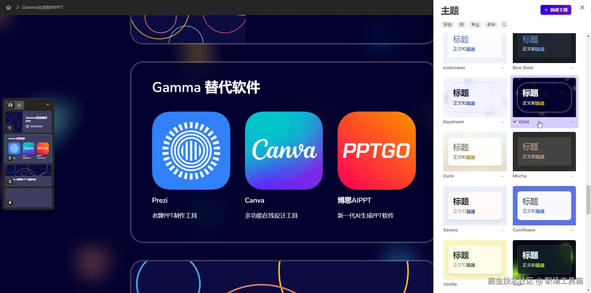 下图是Gamma的PPT编辑界面,点击右上角的主题按钮,打开右侧的主题面板,可看到Gamma预置的所有PPT模板,从中选择一个喜欢的主题,即可一键替换全部PPT背景。