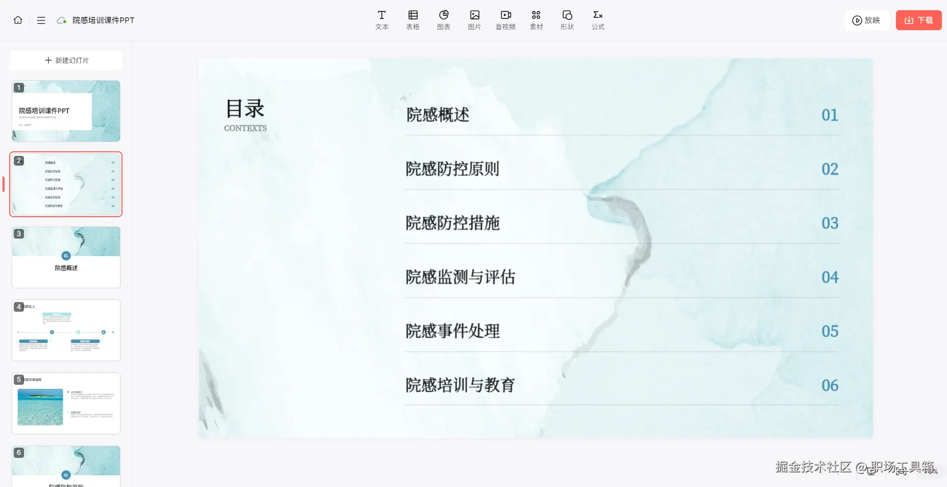 博思AIPPT基于AI自动生成PPT如下图所示,左侧是PPT页面的缩略图,点击即可查看对应页面的内容,当然也可以滚动鼠标滚轮,快速切换右侧窗口显示的PPT页面。